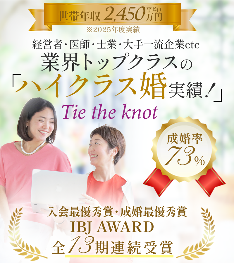 成婚率73%、成婚平均世帯年収2,450万円(2025年実績)とハイクラス婚を得意をするタイザノットで婚活し、理想の未来を掴みたい方をお待ちしています。